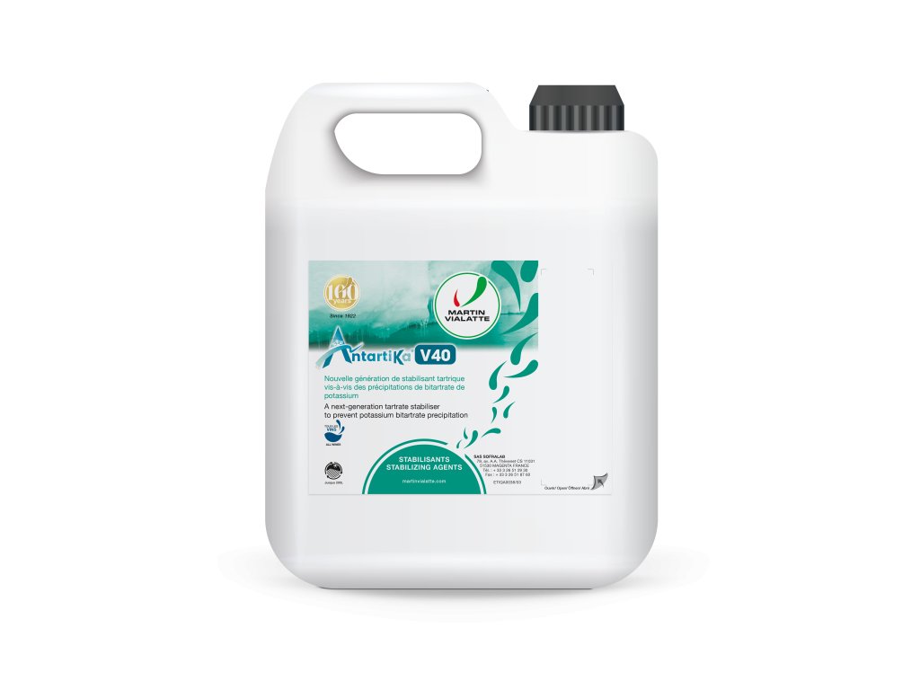 Antartika V40 je 20% roztok draselného polyaspartátu určený na tartrátovú stabilizáciu vín. Pôsobí ako ochranný koloid, ktorý zabraňuje vzniku a rastu mikrokryštálov hydrogentartrátu draselného, bez vplyvu na stabilitu neutrálneho tartrátu vápenatého.